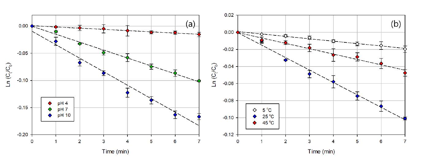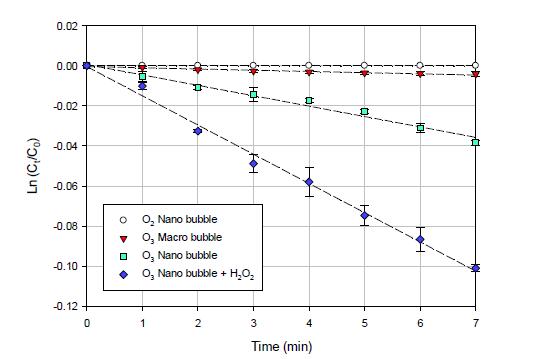 我們在同一反應(yīng)器中僅在H2O2,納米氧氣泡,大臭氧氣泡,納米臭氧氣泡和納米臭氧/ H2O2過程中對TMAH進(jìn)行了降解動力學(xué)。在臭氧化過程中,臭氧氣體不斷流入反應(yīng)器。在納米臭氧/ H2O2反應(yīng)期間,H2O2的初始濃度為100 mg / L。分別使用5 mM乙酸鹽,磷酸鹽和硼酸鹽緩沖液將包含TMAH的合成半導(dǎo)體廢水的pH值分別調(diào)節(jié)為4、7和10。使用冷室和水浴保持合成廢水的溫度。在臭氧化和納米臭氧/ H2O2反應(yīng)期間,分別注入含或不含H2O2溶液的TMAH后,立即將含TMAH和緩沖液的合成廢水置于臭氧中。在實(shí)驗(yàn)期間,環(huán)境空氣溫度保持恒定在5.0、25.0、45.0±1.0°C。