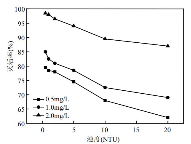 結(jié)果表明,隨著臭氧投量和作用時(shí)間的延長,藻滅活率明顯增加。當(dāng)渾濁度 0.5~20NTU,溫度 5~35 , ℃ pH 值 6.0~9.0,同時(shí)濁度越低,滅活效果越好;隨溫度上升,臭氧滅活銅綠微囊藻能力減弱;堿性較酸性條件下臭氧殺滅銅綠微囊藻的能力更強(qiáng)。藻樣初始濃度對殺藻效果影響較大,細(xì)胞密度增大,殺藻效果急劇下降。當(dāng)初始藻細(xì)胞密度為 1.0×107cells/L,臭氧投量為2.0mg/L,作用時(shí)間 40min 以上時(shí),在飲用水消毒的濁度、溫度、pH 值范圍內(nèi),銅綠微囊藻的滅活率在 99.0%以上,繁殖能力降低到 0。