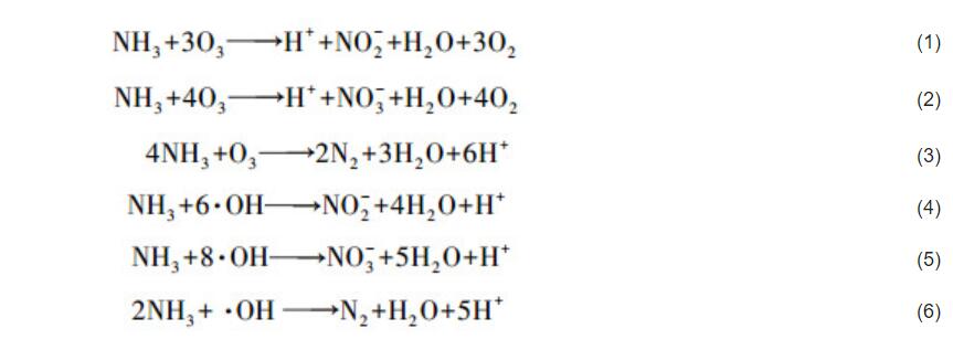 化學氧化法是一種重要的低溫除氨方法, 臭氧氧化法是其中之一.臭氧作為一種相對安全的消毒劑和氧化劑已被廣泛用于水處理中, 其對氨氮有一定的氧化能力(Singer et al., 1975), 且低溫時臭氧的溶解性和有效利用率較高, 因此, 臭氧氧化除氨有可能成為低溫化學除氨的一種有效途徑.O3及其產生的·OH與氨氮的反應方程式分別如式(1)~(2)(Singer et al., 1975)和式(3)~(6)(Chen et al., 2018)所示.