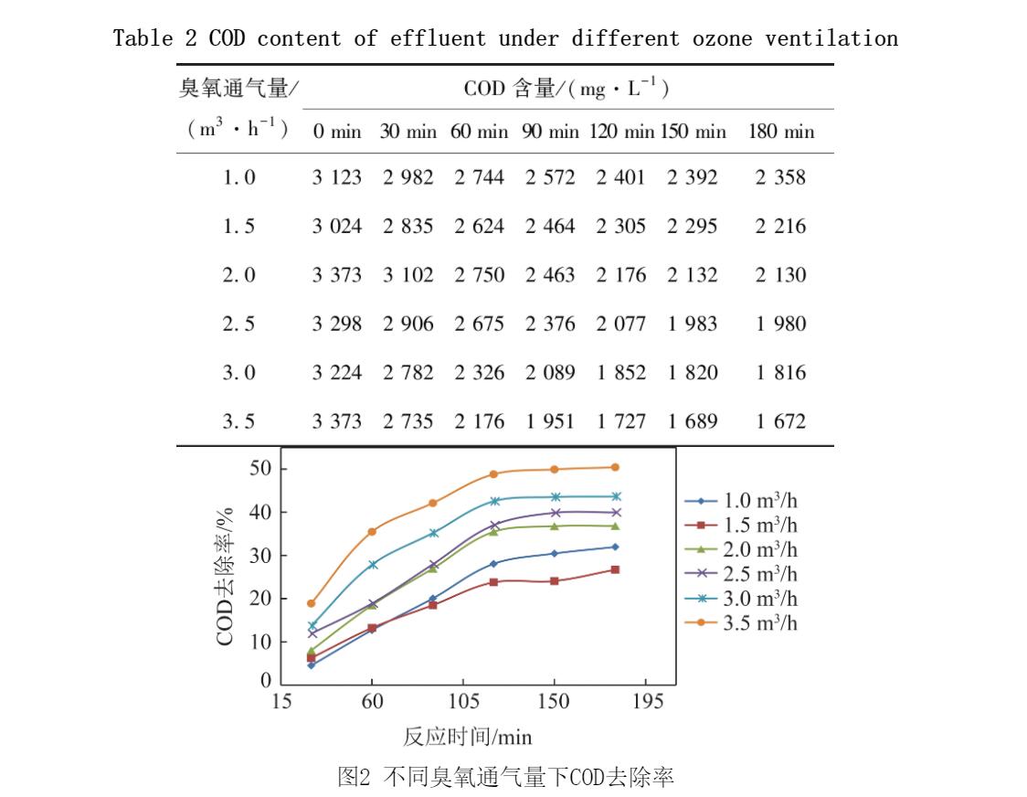 臭氧氧化試驗的進水為脫酚蒸氨出水,具體為出水通過管道進入裝置集水箱,集水箱內設有泵機將廢水按一定流速從反應塔底部進水口進入反應塔,與通過管道從反應塔底部進氣口進入反應塔的臭氧接觸,進行臭氧氧化反應。采用單因素試驗按照制定的不同反應條件進行試驗,分別在0、30、60、90、120、150、180 min取樣,水樣采用0.45 μm膜過濾后分析檢測COD含量及去除率,確定主要影響因素即臭氧通氣量、催化劑投加量及臭氧濃度。