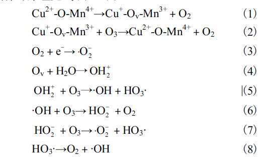 Cu 摻雜會(huì)增加比表面積,改變化學(xué)鍵,并促進(jìn)多價(jià)金屬的轉(zhuǎn)化和氧空位的產(chǎn)生[12].加入Ce 后,催化劑中的小半徑的Cu-Mn 取代了CeO2 中的大半徑的Ce,進(jìn)入到CeO2晶格中,從而產(chǎn)生很多的表面空位,形成缺陷結(jié)構(gòu),加快了供氧速度,從而提高了催化劑活性,促進(jìn)對(duì)O3的轉(zhuǎn)化率[13–14].Mn 與Cu 的氧化物復(fù)配會(huì)產(chǎn)生錳銅固溶體,從而導(dǎo)致晶格氧的缺陷,有效地改善了催化劑吸附和活化氧的能力,并且通過(guò)兩者的復(fù)配形成的銅錳尖晶石將進(jìn)一步提高催化劑的活性,原理見式(1)—(8).