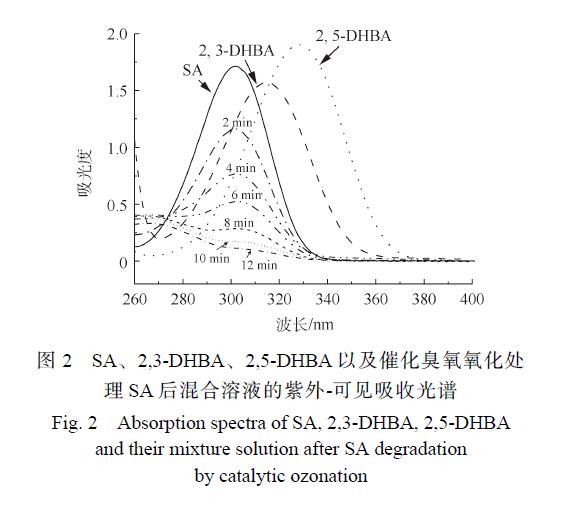 圖 2為 SA、2,3-DHBA和 2,5-BHBA的紫外-可見吸收光譜圖以及 CaO催化臭氧氧化處理后的紫外-可見吸收光譜??梢钥闯?,SA在 302 nm處有 很大吸收峰,而 2,3-DHBA和 2,5-DHBA分別在315 nm和 330 nm處出現 很大吸收峰,SA經過催化臭氧氧化處理后 很大吸收峰波長向右移動,在2,3-DHBA和 2,5-DHBA的大吸收峰處有一定的吸收,證明在該過程中有 · OH產生。