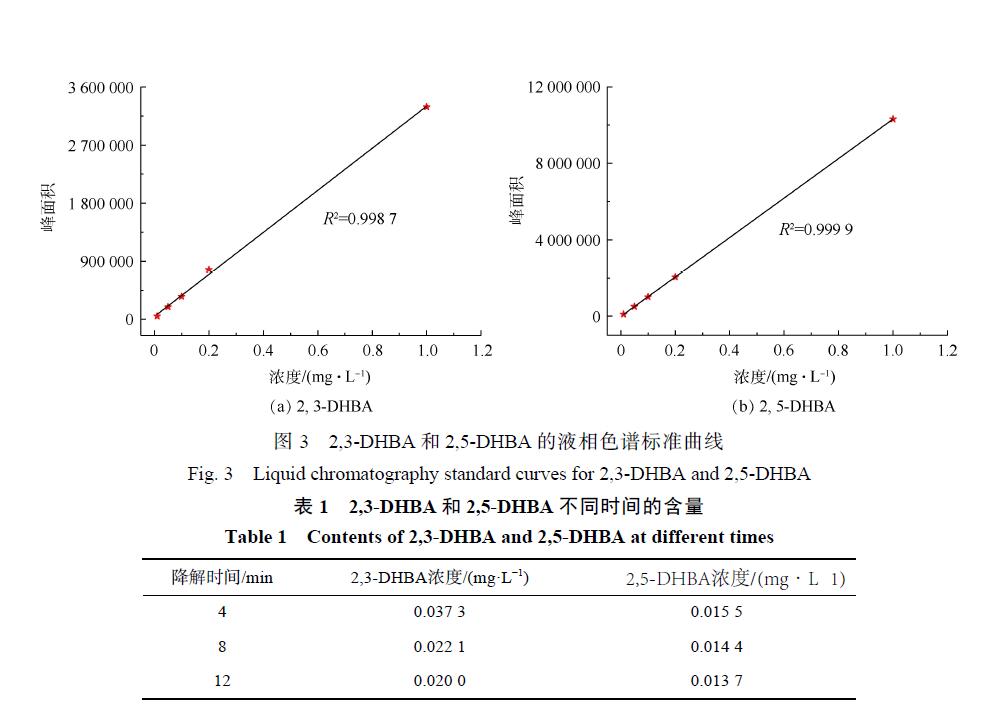 水楊酸 (SA)羥基化實驗是另外一種間接檢測羥基自由基的方法。羥基自由基具有存在時間短、不穩定的特點,但 SA可以作為 · OH的捕捉劑,SA與 · OH反應后會生成較為穩定的 2,3-二羥基苯甲酸 (2,3-DHBA)和 2,3-二羥基苯甲酸 (2,5-DHBA)。本研究結合紫外-可見分光光度計跟蹤 SA與 · OH反應后產物,再結合液相色譜-質譜聯用儀對2,3-DHBA和2,5-DHBA 進行定量分析。