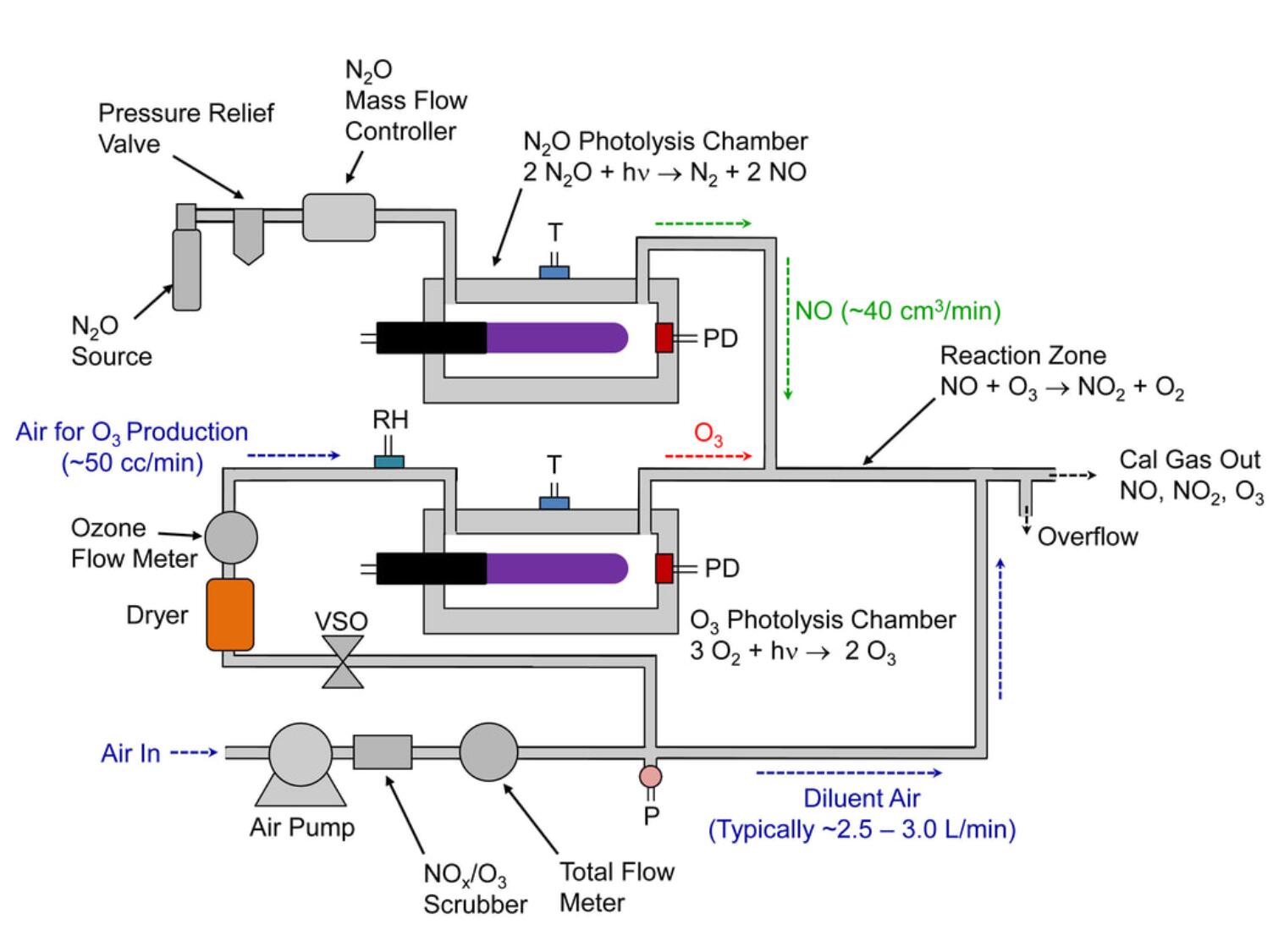 美國2B 714 型 NO 2 /NO/O 3 Calibration Source ™結合了 2B Technologies 的 306 型臭氧校準源™ 和 408 型一氧化氮校準源™ 以產生 O 3、NO 和 NO 2的校準源。714 型使用兩個低壓汞燈,一個用于光解氧氣以產生 O 3,另一個燈用于光解一氧化二氮 (N2 O ) 以產生 NO。在 O 3與過量的 NO 將 NO 轉化為 NO 2的化學計量反應中產生二氧化氮。714 型的示意圖如下所示: