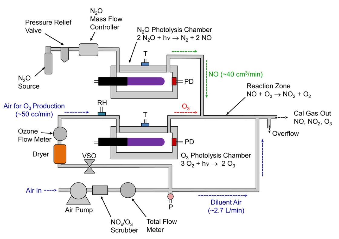 校準(zhǔn)濃度的 O 3是通過光解凈化的環(huán)境空氣中的氧氣產(chǎn)生的,校準(zhǔn)濃度的 NO 是通過使用一氧化二氮 (N 2 O )光解的技術(shù)產(chǎn)生的。