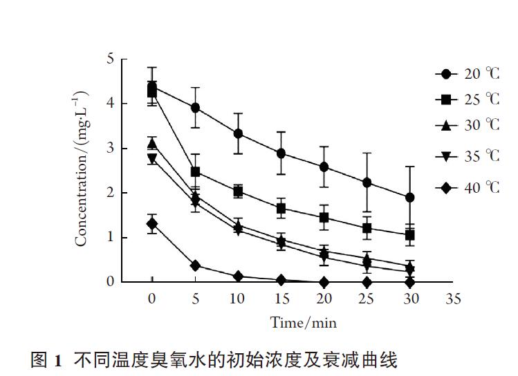 檢測水溫分別為20,25,30,35及40 ℃臭氧水的初始濃度并分別測定室溫(25 ℃)下以上不同溫度的臭氧水在分別靜置5,10,20,及30 min后的臭氧水濃度。