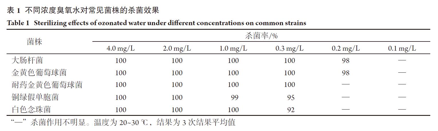 在常溫(25 ℃)常壓下,新制臭氧水作用1 min對標準菌株大腸桿菌(8099 ) 、金黃色葡萄球菌(ATCC6538)、耐藥金黃色葡萄球菌、銅綠假單胞菌菌(9201)、白色念珠菌(ATCC10231)的殺滅率可達100%;濃度為1.0 mg/L臭氧水作用1 min對銅綠假單胞菌的殺滅率為99%,對其他常見菌的殺滅率為100%。濃度為0.3 mg/L臭氧水作用1 min對大腸桿菌、金黃色葡萄球菌、耐藥金黃色葡萄球菌、銅綠假單胞菌及白色念珠菌的殺滅率分別為100%,100%,100%,95%和92%。濃度為0.2 mg/L臭氧水作用1 min對大腸桿菌、金黃色葡萄球菌的殺滅率均為98%(表1)。