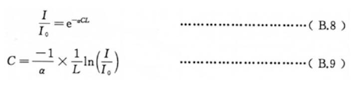臭氧對(duì)254 nm 波長(zhǎng)的紫外光有特征吸收。臭氧化氣樣品和參比氣體( 不含臭氧的空氣或氧氣)分別以恒定的流速進(jìn)入儀器的吸收池,參比氣通過吸收池時(shí),被光檢測(cè)器檢測(cè)的光強(qiáng)為I0,樣品氣通過吸收池時(shí)被檢測(cè)器檢測(cè)的光強(qiáng)為I 0。I / I 0 為透光率。儀器的微處理系統(tǒng)根據(jù)朗伯- 比爾定律計(jì)算出臭氧濃度,這些量之間的關(guān)系表示為式(B.8) 或式(B.9):